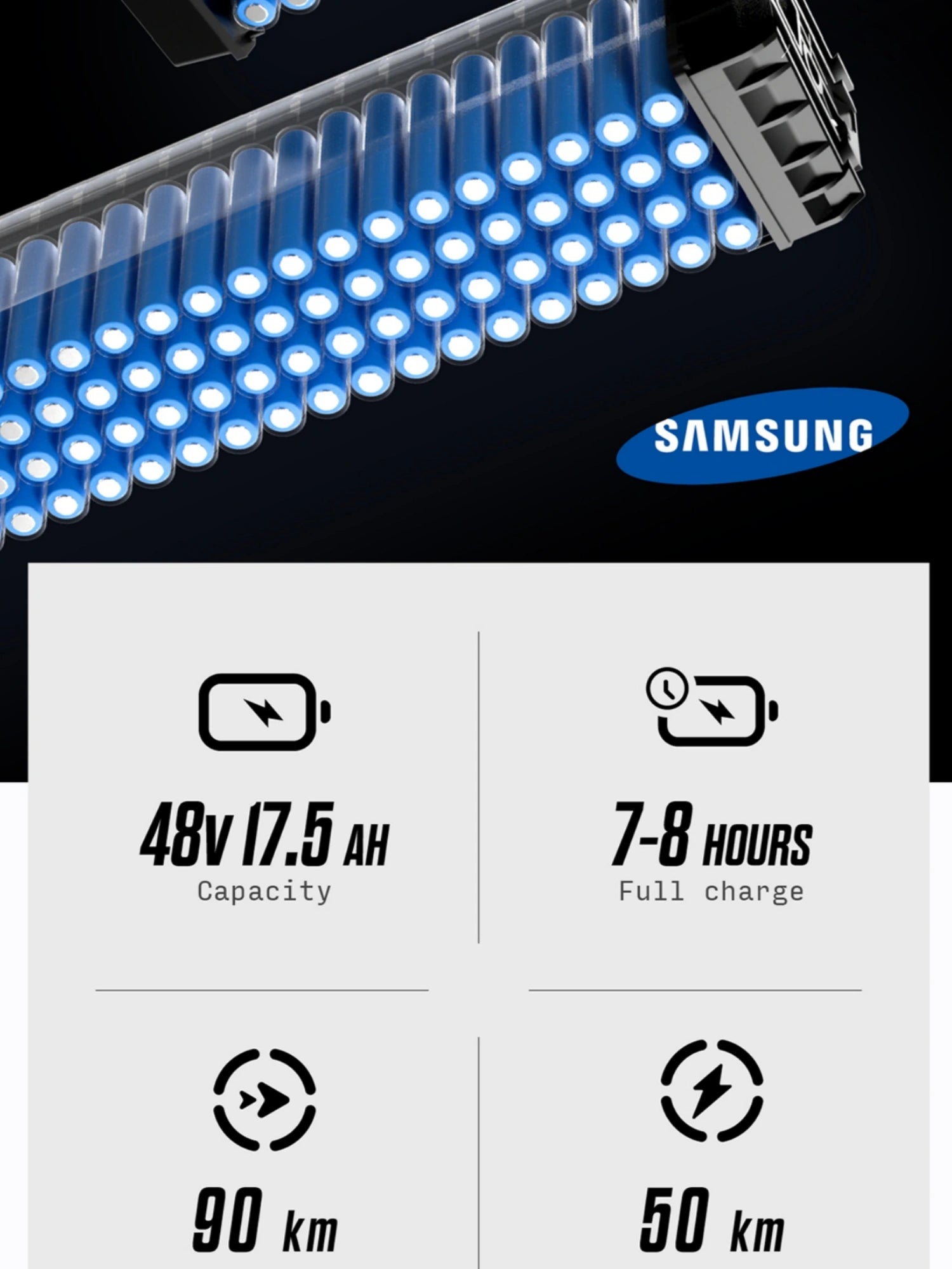 Enjoy extended journeys with the Shengmilo MX06, featuring a Samsung 48V 17.5Ah lithium battery. Get over 90 km of pedal-assist range or 50 km at full throttle on a single charge, with a full recharge in just 7–8 hours. Built for reliability and high performance, this battery keeps your daily commutes and weekend adventures powered smoothly and confidently.