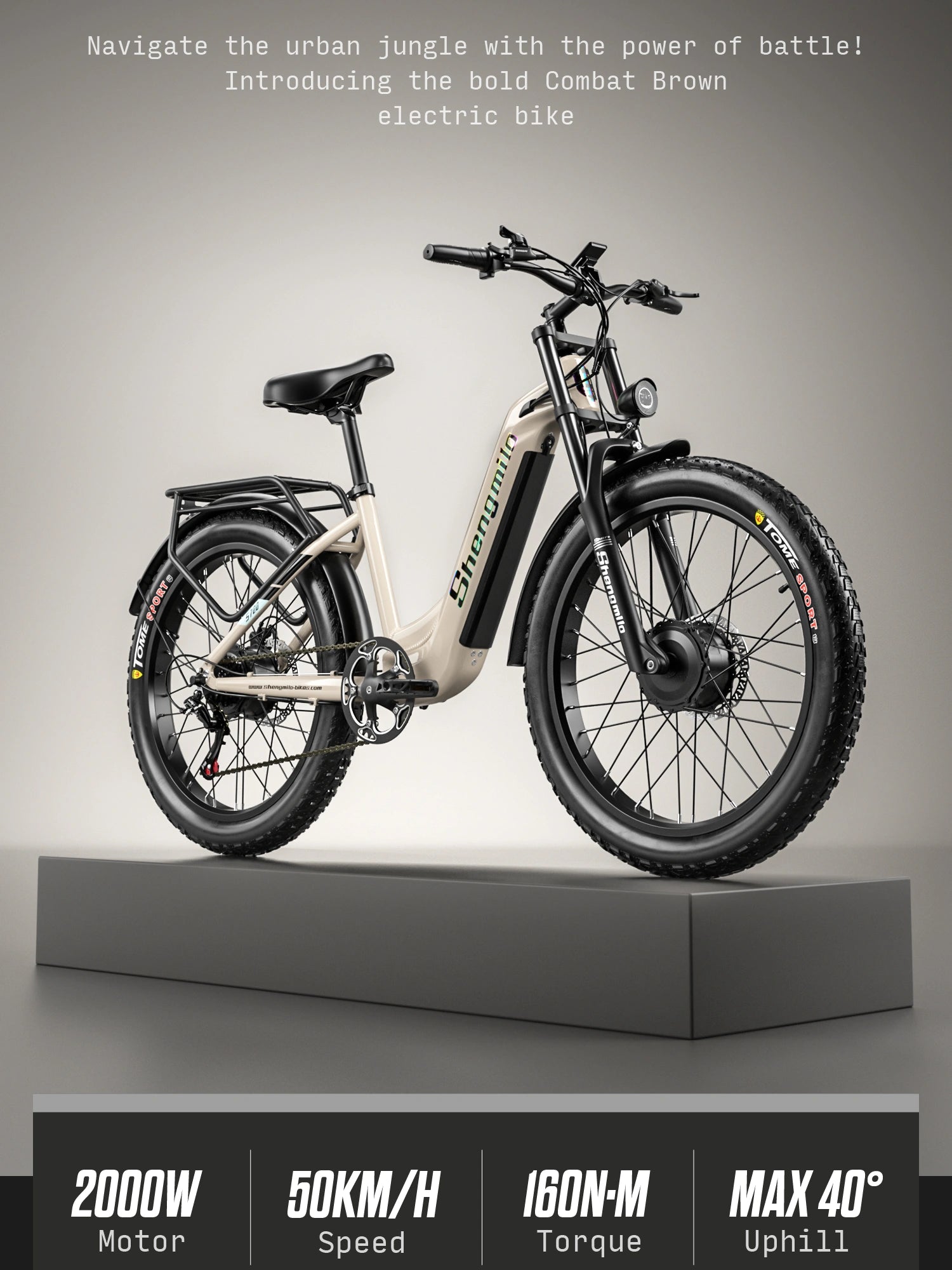 Take on the city and beyond with unstoppable power! Featuring a 2000W motor, 160 N·m of torque, and a top speed of 50 km/h, this e-bike tackles hills with ease, climbing up to 40° effortlessly. From busy urban streets to rugged off-road trails, the Combat Brown combines strength, speed, and bold style, making every ride an exciting adventure.