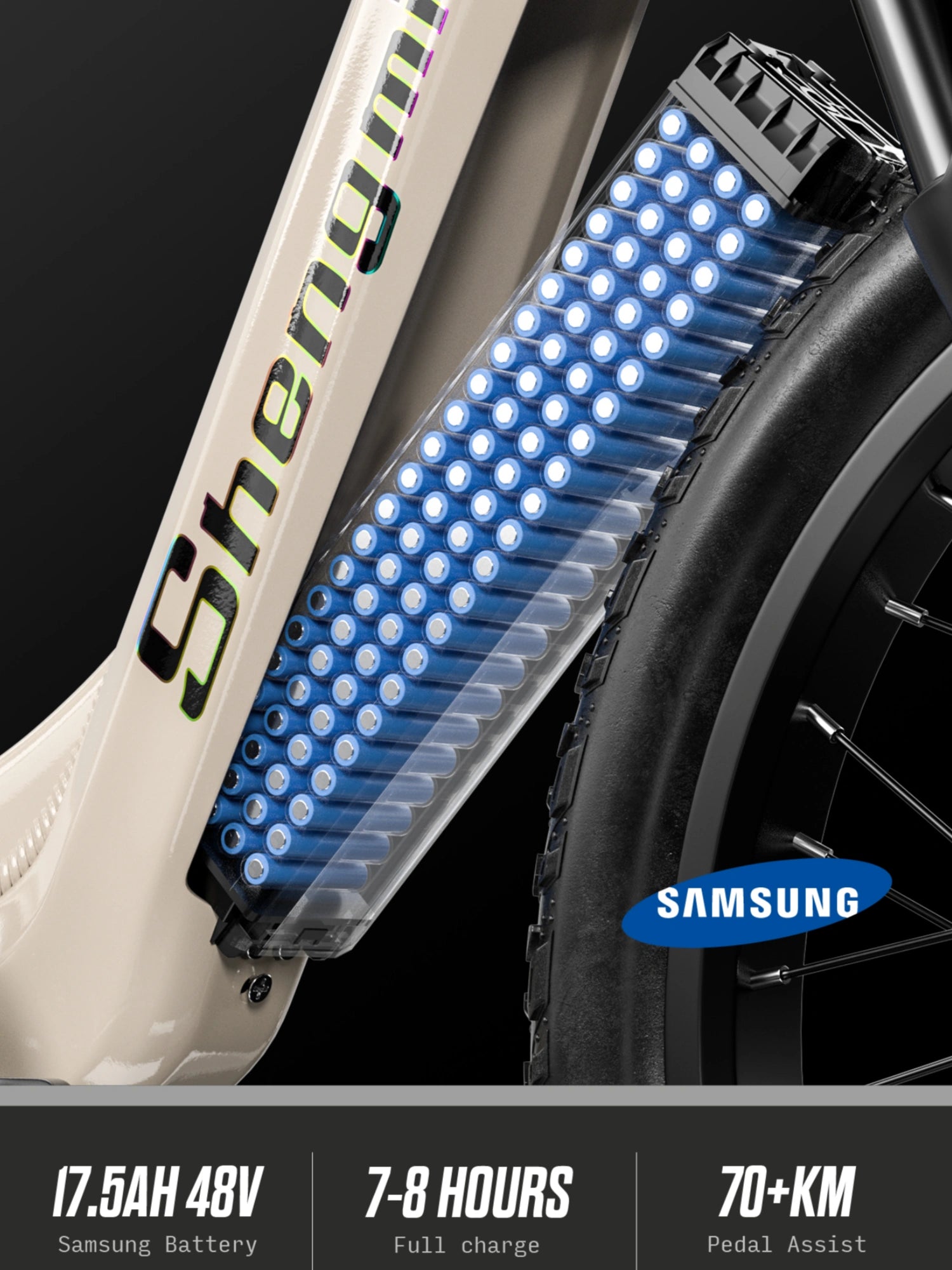 Enjoy extended rides with the Shengmilo S700, featuring a Samsung 48V 17.5Ah lithium battery. With over 70 km of pedal-assist range on a single charge and a quick 7–8 hour full recharge, this high-performance battery is built for reliability and efficiency. Whether you’re commuting through the city or heading out for weekend adventures, it ensures every journey is powered smoothly and confidently.