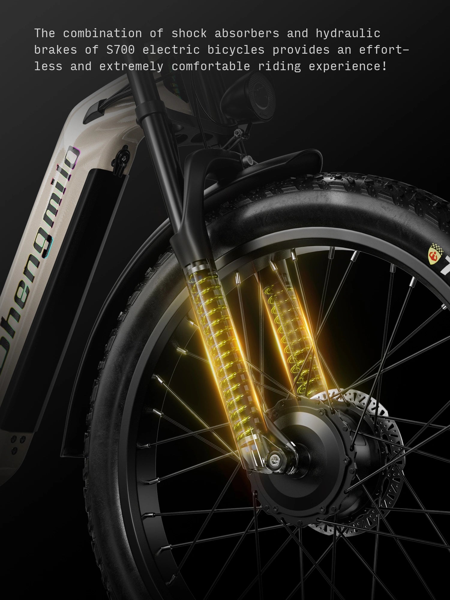 Experience ultimate comfort and control with the S700 e-bike’s double shoulder fork and hydraulic brake system. The combination of advanced shock absorbers and responsive hydraulic brakes ensures every ride is smooth, effortless, and exceptionally comfortable. Whether you’re navigating city streets or tackling rough terrain, this system keeps you in full control and maximizes your riding enjoyment.